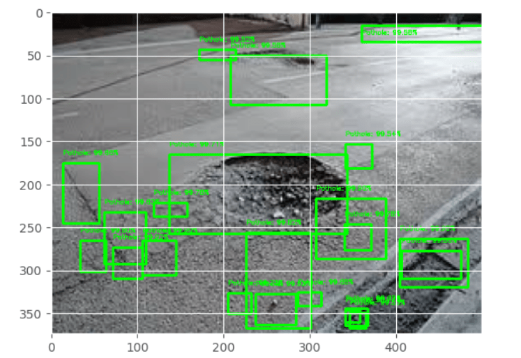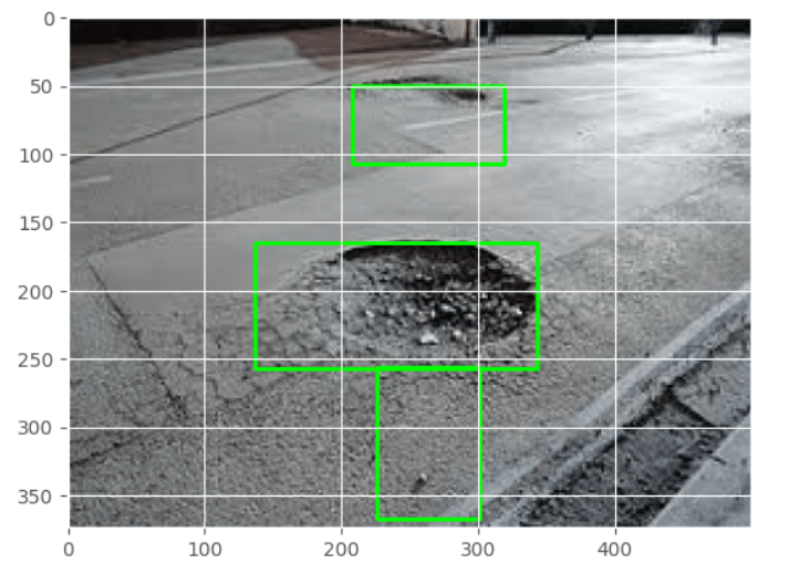 As we can see we have the bounding boxes over the potholes and also regions around them also. However we can see that we have multiple overlapping boxes which ultimately needs to be reduced. So our next task is to apply non maxima suppression to reduce the number of bounding boxes.