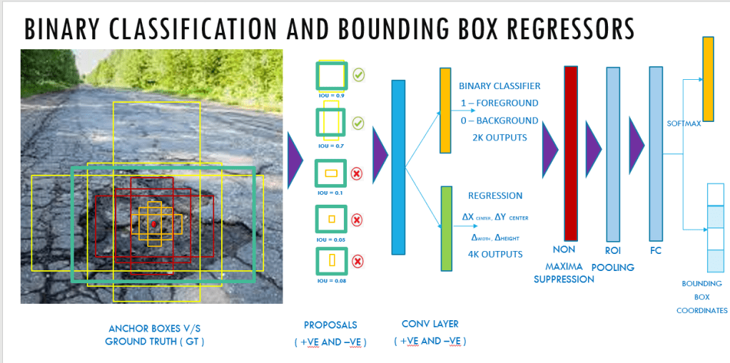 The binary classifier classifies the proposals as foreground ( containing an object) and background ( no object) and the regressor outputs the delta or adjustments that needs to be made to the reference anchor box, to make it similar to the ground truth bounding boxes. After these two steps in the RPN layer, the proposals are sorted based on the probability score as to whether it is foreground and background and then it undergoes Non maxima suppression to reduce the overlapping bounding boxes.
