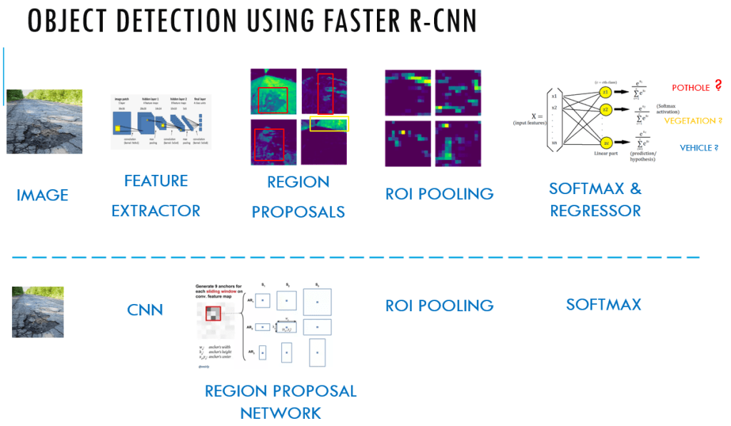 The reduced number of bounding boxes are then propogated to an ROI pooling layer which reduces the dimensions and then goes through the fully connected layers to the final softmax layers and the regressor layers. The softmax layer detects what type of object it is ( whether it is a pothole or vegetation or sign board etc) and the regressor layer gives the adjusted bounding boxes to that object.