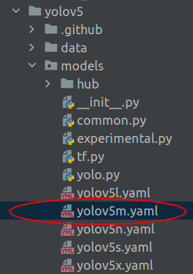 cfg : This is the configuration file which defines the model architecture. This file would be available in the folder yolov5/models as shown below.