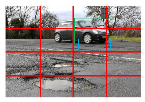 In our case, let us consider that B = 2. So each cell will predict 2 boxes where there is some probability of an object. Let us take the grid as shown in the above picture, where two boxes are predicted. That cell was able to detect a pothole and the car, and we can also see that the center of the boxes are also in the same cell. This process of predicting boxes happens for every cell within the image. In the course of this step multiple overlapping boxes will be predicted across all the grids of the image.