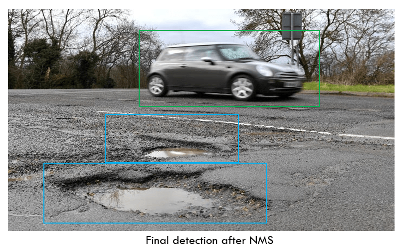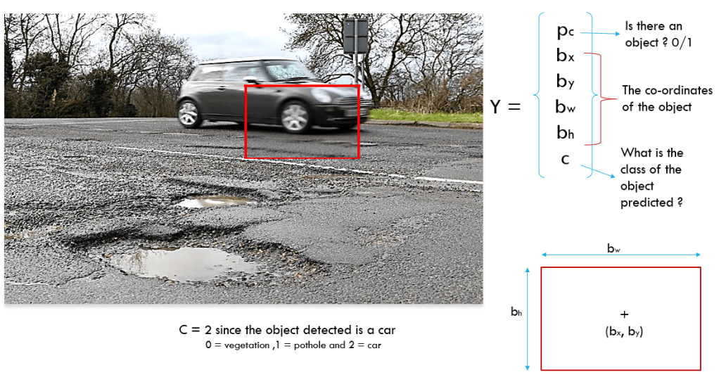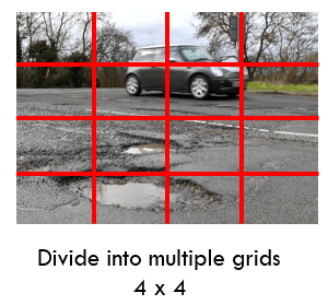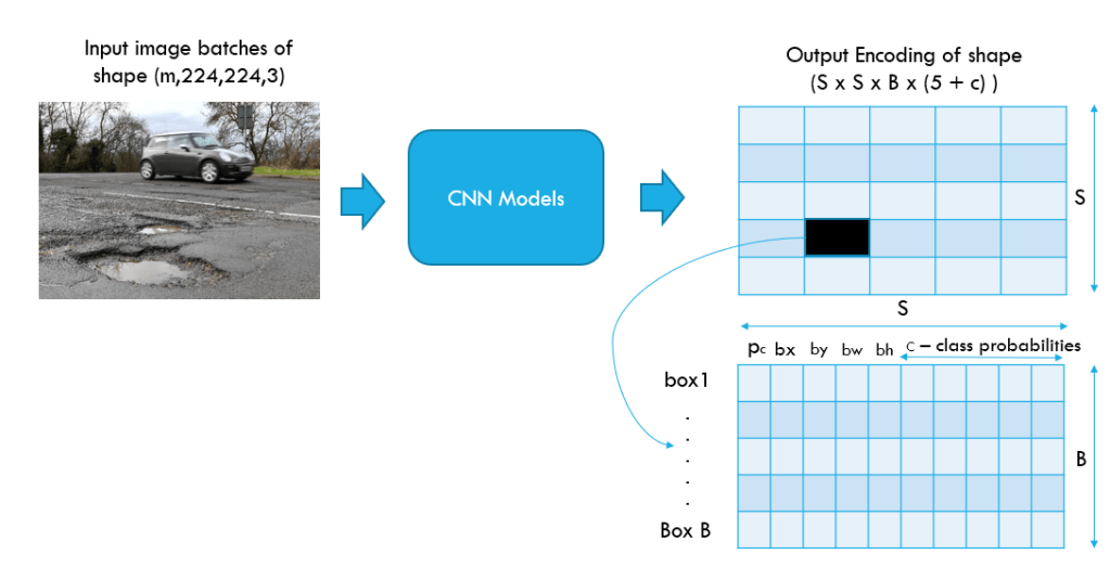 Along with the boxes and confidence scores a class probability map is also predicted. A class probability map gives the likelihood of the presence of a class in each of the cell. For example, vehicle in cell 2,3,4 …. and pothole in cell 9,10,11,…. etc.