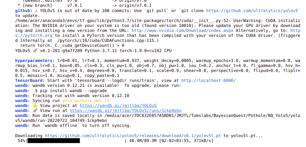 The training is a time consuming activity and can be visualized on Tensorboard by entering the following command on a terminal. Please note that the terminal should be pointing to the yolov5 folder. The log details required to run Tensorboard will be available in runs/train folder
