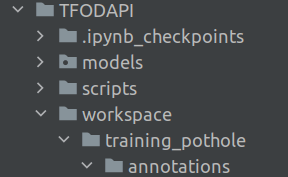 We first create a folder called workspace, under the TFODAPI folder. The workspace folder is where we keep all the training configurations. Let us look at the subfolders of the workspace folder.