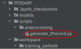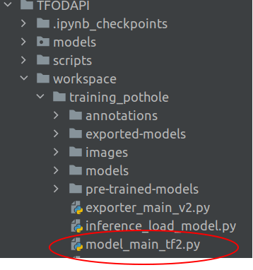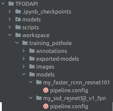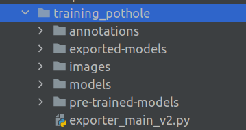training_pothole : This folder is where the training process gets implemented. Each time we do a training, it is advisable to create a new training_pothole subfolder. This folder has different subfolders under it as follows.