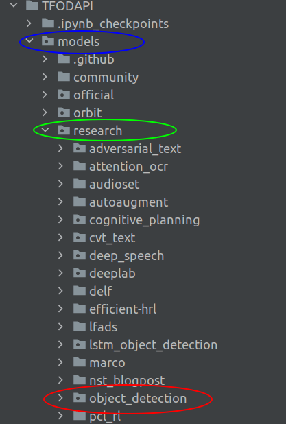 Please note that in the installation link provided above, the root folder would be named as 'Tensorflow', however in the installation followed here the root folder is named as 'TFODAPI'. Other than that, the important folder which you need to verify is the /models folder and the other folders created under it. Once this structure is in place, we can get into the next step which is to start the training process using the Custom object detector.